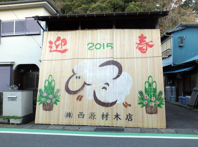 | 西叶神社へ参拝した帰途,西浦賀の裏道を歩いていると新年挨拶の大きな看板?が目に入った。普通,店舗や施設の新年挨拶にはA4かA3サイズの用紙が使用されているが,西源材木店の店頭に飾られたそれは畳十畳くらいはあると思われるものだった。商品の材木を並べて立てかけ,カラースプレーで絵と文字を書いたと思われるが,なかなか見事な出来映えだった。 | |