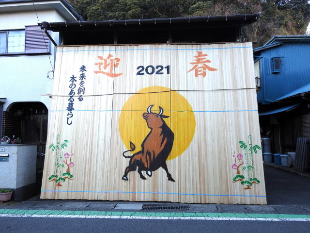 | 例年,西叶神社近くにある西源材木店の店頭には,商品の材木を並べて立てかけ,カラースプレーで絵と文字を書いたと思われる新年挨拶の大きな看板が飾られる。普通,店舗や施設の新年挨拶はA4かA3サイズの用紙が使用されているが,西源材木店のそれは,畳十畳くらいはある超特大サイズ。カラースプレーで一気に書き上げたと思われるが,毎年なかなか見事な出来映えで西叶神社へ初詣に訪れた人たちが,その前で代わる代わる記念写真を撮っている姿が微笑ましい。 | |