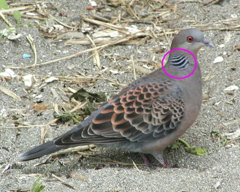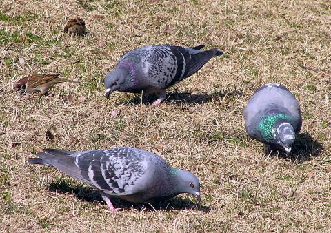 | キジバトとドバトはほぼ同じ大きさをしているが,見分け方は比較的簡単だ。キジバトはほとんど一羽か二羽で行動するのに対して,伝書バトが野生化したドバトは,群れで行動することが多い。外見上の特徴的な違いは,キジバトの首にある青と白の縞模様,ドバトにはこの縞模様がないので一目で見分けることができる。 また,キジバトはオス・メスに関わらずどれも似たような模様や色合いをしているが,ドバトはそれぞれ個性的で,少しずつ模様や色合いが異なっているのが面白い。 |