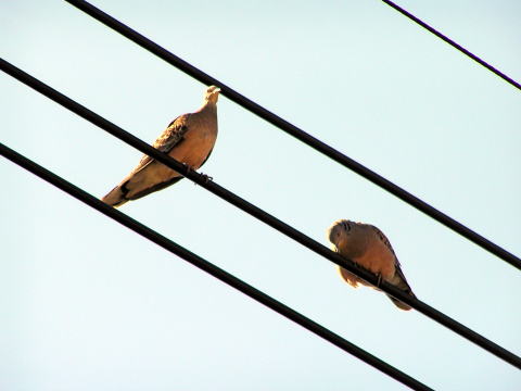 | 繁殖期になると,つがいでケーブルの上に留まり,オスがメスにプロポーズする姿を時々見かける。まずは揃って身だしなみの羽繕い?それが終わると,オスの求愛行動が始まる。 横を向いて素知らぬ顔をきめこむメスに,オスは頭をコックリコックリ上げ下げ“ククルククー・ククルククー”と鳴きながら,懇願するようにメスへにじり寄る。メスがプロポーズを受け入れ,オスの方に顔を向け微笑み返す?と,めでたく求愛成立となる。 ところが,メスが何か気に入らないことがあると,プイと横を向いたまま,時には飛び去ってしまうこともある。一羽取り残されたオスの姿はなんとも気の毒で,我が身につまされる思いだ。 |