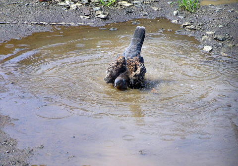| こんな浅い水溜まりで溺れるはずもないのに?と思いながらも,私はカメラ片手に隣の空き地へ駆けつけた。そこで見たキジバトの姿に私は唖然とさせられた。溺れているように見えたのは目の錯覚で,まるで手品の種明かしでも見ているような姿がそこにあった。 | |