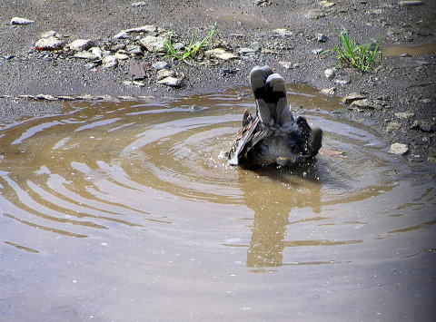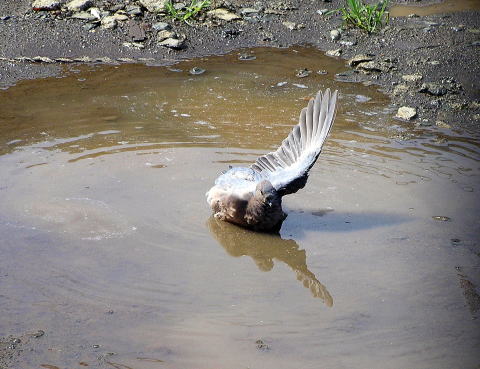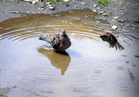 | スズメの気持ち良さそうな姿に刺激されたのか,キジバトが右や左に羽を広げて,ウオーミングアップのような仕草をしたかと思うと,身体全体を浅い水溜まりにつけて,ブルブルと身体を震わせた。そのあまりにも激しい動きにスズメはビックリ仰天,飛び上がって,何処かへ飛び去ってしまった。 | |