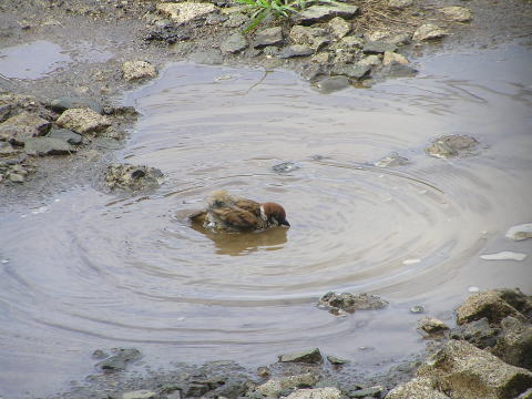 | 前夜来の大雨で,我が家の隣の空き地に小さな水溜まりができた。そこでスズメが一羽,羽虫でも落としているのだろうか?気持ち良さそうに水浴びをしていた。何げなくそれを眺めていると,キジバトが一羽あらわれて,スズメの様子をジッと見つめていた。 | |
