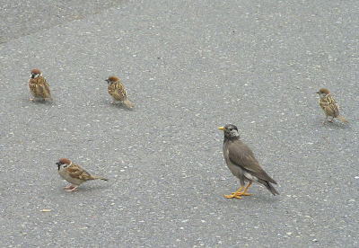 | 我が家近くの公園のケヤキの虚(うろ)でムクドリのヒナが誕生した。ヒナは一羽のようだ。地上4〜5mの高さにある虚の中から,ヒナが時々顔を出し辺りを窺っている。親鳥がエサをくわえて帰ってきた気配を察すると,ヒナは大きな口を開けてギャーギャー騒ぐが,親鳥は巣へは直行しない。天敵のカラスに巣の存在を知られないための防衛本能なのだろう。 ムクドリは普通,数個のタマゴを産むはずなので,現在ヒナが一羽と言うことは,その他のヒナは既に巣立ったか,カラスの餌食となったかのどちらかと思われる。巣のあるケヤキの傍の電線に留まった親鳥は,辺りをキョロキョロ用心深く見回して,カラスがいないのを確認してから,巣に近づきヒナにエサを与えている。 ムクドリのヒナの食欲はどん欲で,親鳥のオスとメスとが代わる代わるエサを運んでくるが,その度に大きな口を開けてエサを呑み込んでいる。この食欲であれば,巣立ちの日も近いと思われる。 |