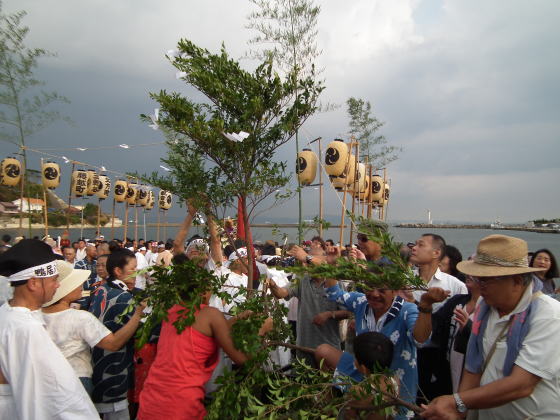 ![]() 神事が終わると人々は会場に飾られていた縁起の良い榊の枝を我先に持ち帰った |