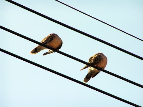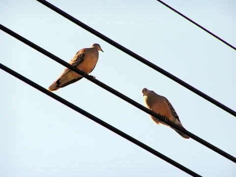 | 繁殖期になると,つがいでケーブルの上に留まり,オスがメスにプロポーズする姿を時々見かける。まずは揃って身だしなみの羽繕い?それが終わると,オスの求愛行動が始まる。 横を向いて素知らぬ顔をきめこむメスに,オスは頭をコックリコックリ上げ下げ“ククルククー・ククルククー”と鳴きながら,懇願するようにメスへにじり寄る。メスがプロポーズを受け入れ,オスの方に顔を向け微笑み返す?と,めでたく求愛成立となる。 ところが,メスが何か気に入らないことがあると,プイと横を向いたまま,時には飛び去ってしまうこともある。一羽取り残されたオスの姿はなんとも気の毒で,我が身につまされる思いだ。 |