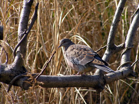| キジバトの名前の由来は,羽縁が赤褐色で,ウロコ状に見える模様が,キジのメスの上面に似ていることからきているが,ヤマバトの別名もある。鳴き声は“デデポッポー・デデポッポー”とのどかな感じで,鳴き声からはヤマバトの名がふさわしい気がする。 ヤマバトと呼ばれるのは,かって市街地には少なく,山里で繁殖,冬に市街地へ訪れる漂鳥だったからだが,今では都心でも見られるほど,ポピュラーな野鳥で,観音崎公園内は勿論,周辺の住宅地でも見かけることが多い。 |
