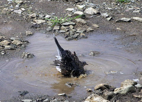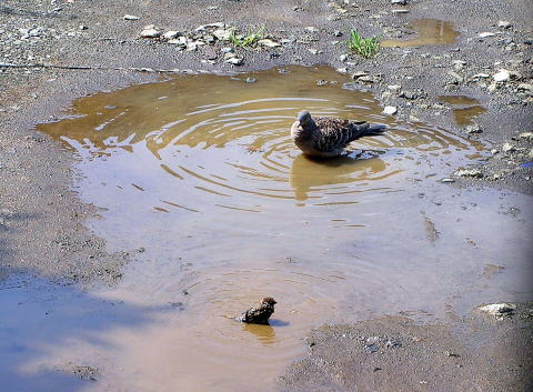 | スズメの気持ち良さそうな姿に刺激されたのか,キジバトが右や左に羽を広げて,ウオーミングアップのような仕草をしたかと思うと,身体全体を浅い水溜まりにつけて,ブルブルと身体を震わせた。そのあまりにも激しい動きにスズメはビックリ仰天,飛び上がって,何処かへ飛び去ってしまった。 | |