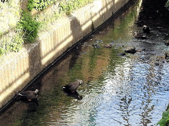 | ④鴨居小前ー⑤東橋間は①の斎場脇と並んで野鳥の観察スポット。主につがいのカルガモがオレンジ色のシートの下辺りでなにやらエサをついばんでいるのをよく見かけました。ところが,右上の駐車場辺りにあった「好文堂」という昔ながらの文房具屋さんが廃業,家屋も解体されてしまった影響で,周辺が以前より明るくなってしまったような気がします。カルガモはあまり人を恐れない鳥なので心配ないと思われますがいささか気にかかります。。 | |